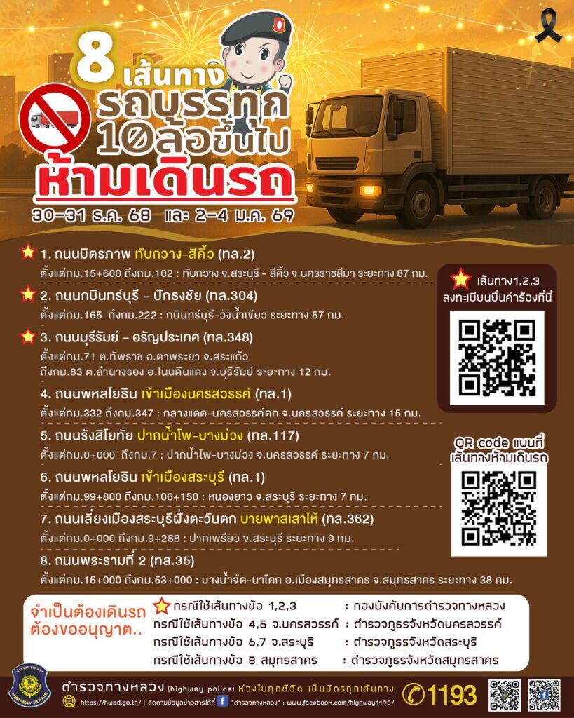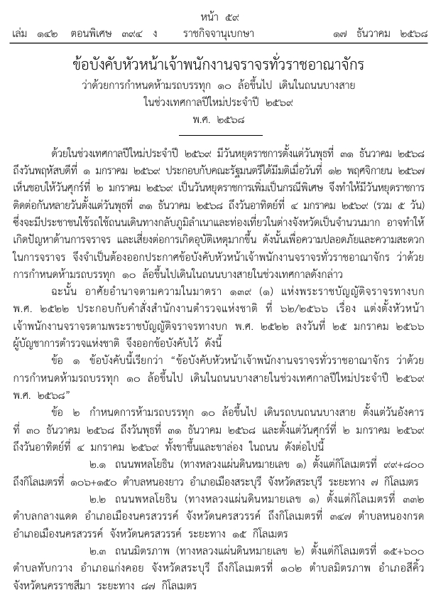ว่าด้วยการกำหนดห้ามรถบรรทุก 10 ล้อ ขึ้นไปเดินรถในถนนบางสายในช่วงเทศกาลปีใหม่ประจำปี 2569